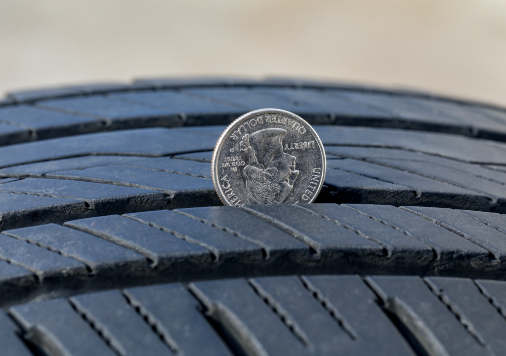 • As we did before, place the quarter upside down into the tread groove with Washington’s head facing toward you. If the tread reaches Washington’s head, you have at least 4/32” of tread remaining, AKA your tires are still in good shape and there’s nothing to worry about!