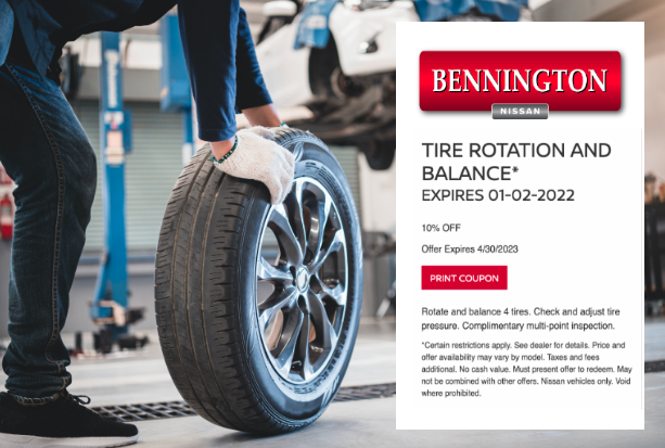 Maintaining your car is essential to ensuring it stays in top condition and runs smoothly on the road. One of the most critical components of your car is its tires, which provide the necessary traction and stability to keep you safe while driving. As such, it’s essential to have your vehicle’s tires rotated and balanced regularly. Tire rotation and balancing are crucial maintenance procedures that involve shifting the position of the tires and adjusting their balance to ensure even wear and tear. These procedures help to extend the life of your tires, increase fuel efficiency, and improve overall vehicle performance. And if you choose to have your tires rotated and balanced at Bennington Nissan this April you could save big! Don’t miss out on this awesome service offer! Claim yours today!